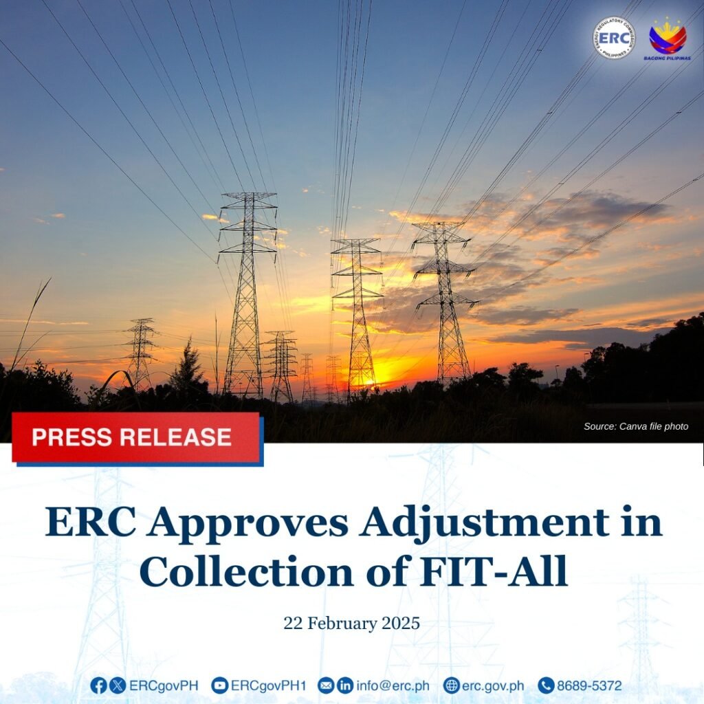 PASIG CITY—The Energy Regulatory Commission (ERC) approved the National Transmission Corporation (TransCo)’s application for the Feed-in Tariff Allowance (FIT- All) for 2024, setting the rate at PhP0.1189/kWh. The collection of the adjusted FIT-All will take effect starting March 2025 billing.