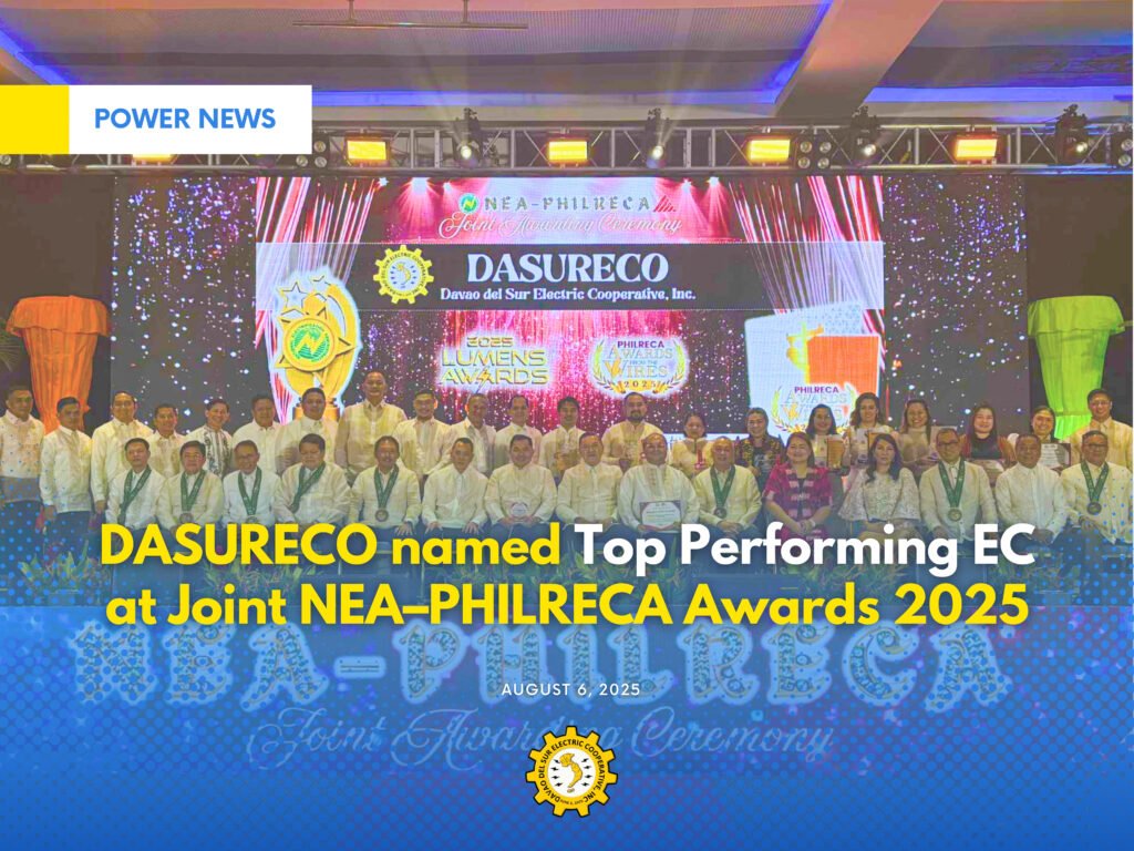 Davao del Sur Electric Cooperative, Inc. (DASURECO), a consistent Top Performing Electric Cooperative for many decades, proudly brought home multiple recognitions during the Joint NEA 2025 Lumens Awards and PHILRECA Awards from the Wires 2025, held on August 9, 2025 at the SMX Convention Center in Bacolod City.